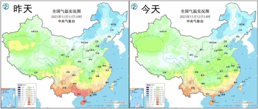 更猛烈的降温出现在南方。从11日和12日14时同时次气温实况图看,10℃气温线大举南推,最南端已进入广西北部。四川、重庆、贵州、湖南、江西、浙江、上海、广西等地均出现较明显降温,尤其广西不少地方直接从夏天跌到了深秋。