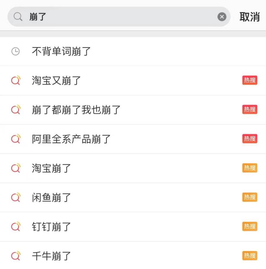 7点50分,在微博搜索栏中输入“崩了”,出现一系列阿里相关搜索词。来源:微博截图