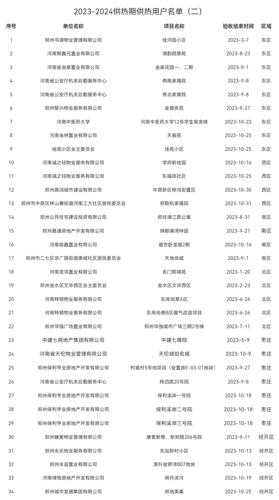 11月13日,郑州热力集团网站发布2023~2024供热期供热用户名单(二),此次确定供热用户34个。