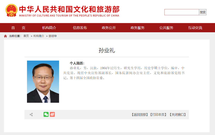 据文化和旅游部官网“部领导”栏目显示,孙业礼已任文旅部党组书记。