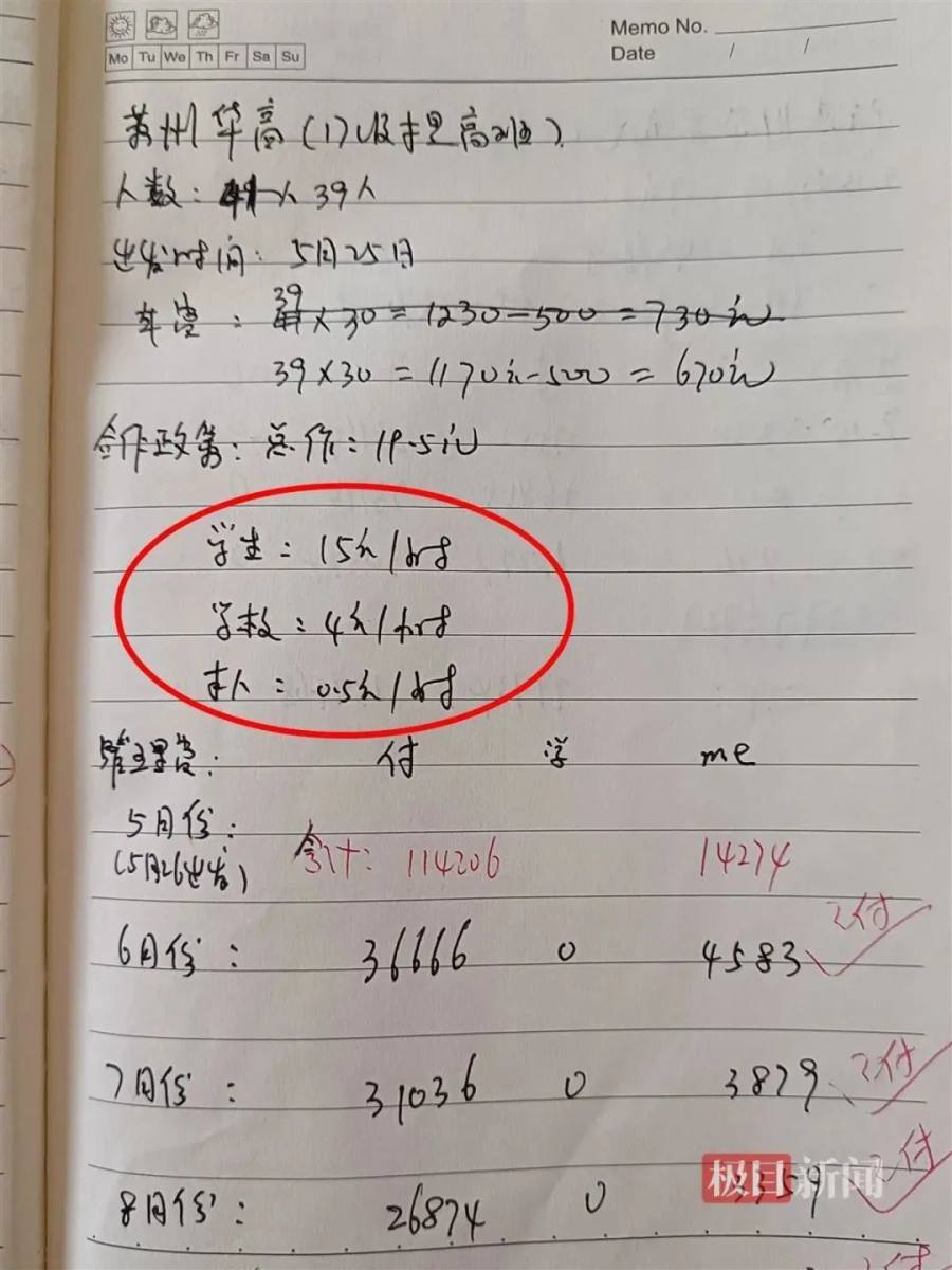 一名普通校职工账户的资金流动高达600万元,其中隐藏了什么猫腻?张老师透露,颜某某是学校院长助理,主要负责学校每年的招生工作和学生的实习工作,银行流水也显示这些收入与其工作有关系。账本截图显示,企业给学校的实习时薪为19.5元/小时,而学生得到的却只有15元/小时。其中,学校收取4元/小时,颜某某收取0.5元/小时。按此比例,学生报酬的23%都要被学校抽走。