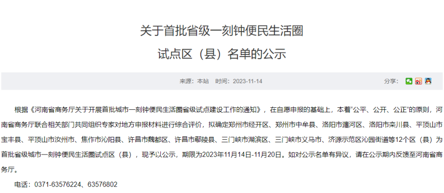 11月14日,河南省商务厅公示首批省级一刻钟便民生活圈试点区(县)名单,公示期限为2023年11月14日-11月20日。