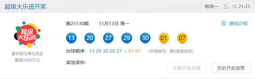 11月13日,体彩超级大乐透第23130期前区开出号码“13、20、27、29、30”,后区开出号码“01、07”。当期全国销量为3.07亿元,为国家筹集彩票公益金1.10亿元。