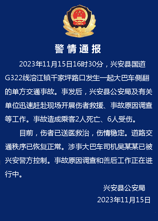 该事故造成乘客2人死亡、6人受伤。目前,伤者已送医救治,伤情稳定。道路交通秩序已恢复正常。涉事大巴车司机吴某某已被兴安警方控制。事故原因调查和善后工作正在进行中。