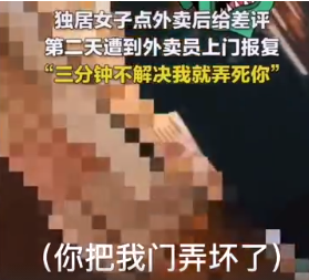 近日,上海的张女士称,自己因点外卖给了差评,遭到外卖员上门报复,不仅被砸门、辱骂恐吓,还被勒索200元的“赔偿”。爆料视频显示,外卖员大吼:“差评给我取消掉!3分钟解决不了,我就弄死你!”