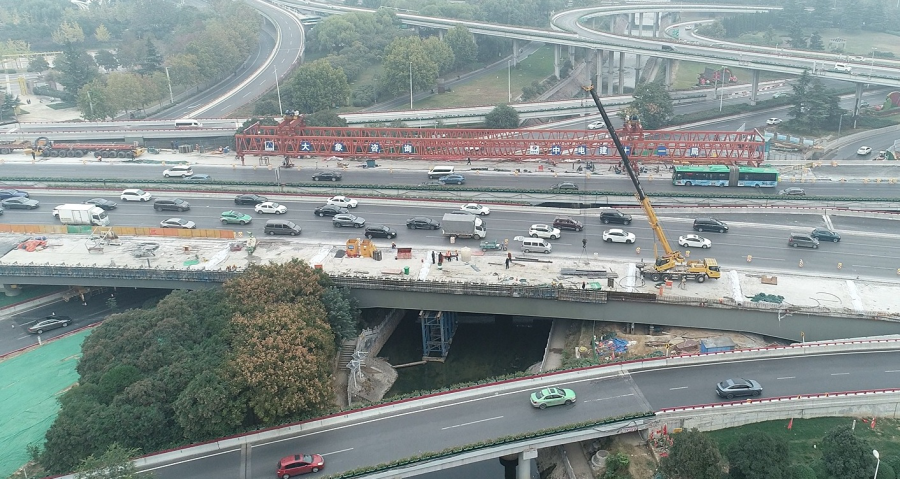 施工现场,郑州市金水路立交西侧主线架桥机已拆除,正在养护砼叠合板后浇带;东侧主线架桥机已完成全部钢箱梁的架设,架桥机正在拆除中;钢箱梁焊接已全部完成,东西主线钢箱梁拼宽段即将开始浇筑防撞墙、铺装沥青、安装伸缩缝,预计11月下旬,东西主线拼宽桥完成施工通车。