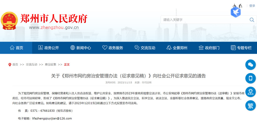 据悉,意见稿由郑州市公安局起草《郑州市网约房治安管理办法(送审稿)》呈报市政府后,经市司法局初审后形成。如有意见和建议,请于2023年12月15日前通过以下方式反馈至郑州市司法局。