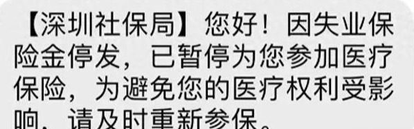 11月18日上午,有网友反映收到深圳社保局短信,称“因失业保险金停发,已暂停为您参加医疗保险,为避免您的医疗权利受影响,请及时重新参保”。