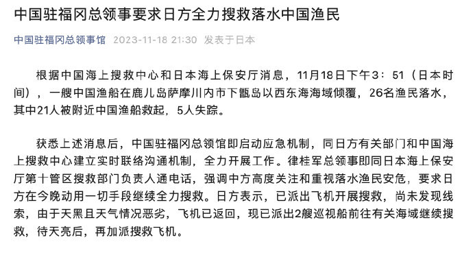 获悉上述消息后,中国驻福冈总领馆即启动应急机制,同日方有关部门和中国海上搜救中心建立实时联络沟通机制,全力开展工作。律桂军总领事即同日本海上保安厅第十管区搜救部门负责人通电话,强调中方高度关注和重视落水渔民安危,要求日方在今晚动用一切手段继续全力搜救。日方表示,已派出飞机开展搜救,尚未发现线索,由于天黑且天气情况恶劣,飞机已返回,现已派出2艘巡视船前往有关海域继续搜救,待天亮后,再加派搜救飞机。