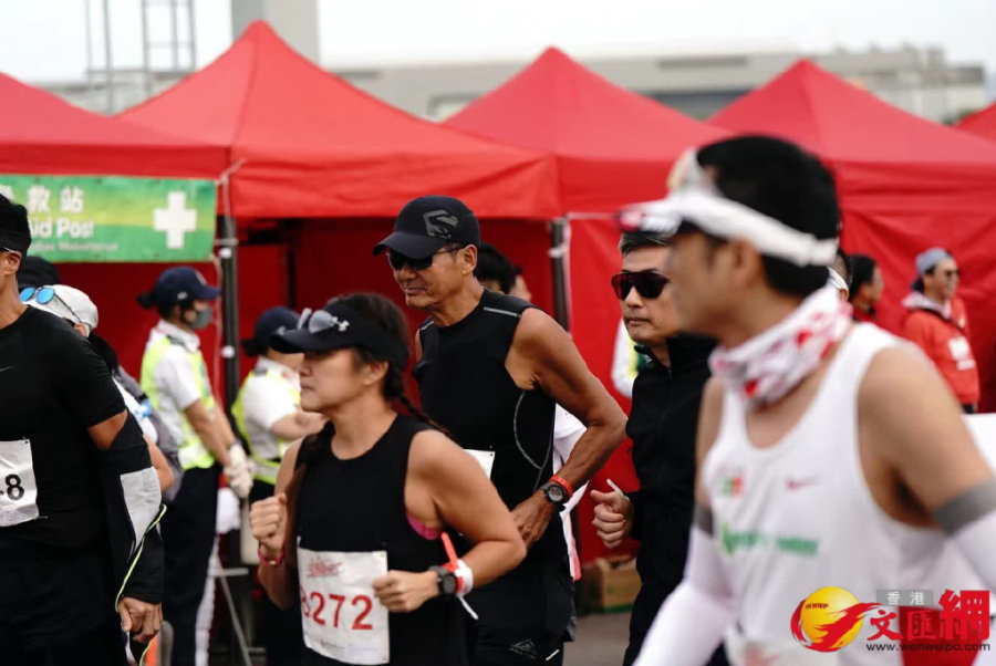 在本场比赛中,“发哥”穿着黑色跑步服、头戴黑色运动帽,尽管在跑道上穿得一如既往的低调,但是当周润发站上赛场,他就自然而然成了人群中的焦点。