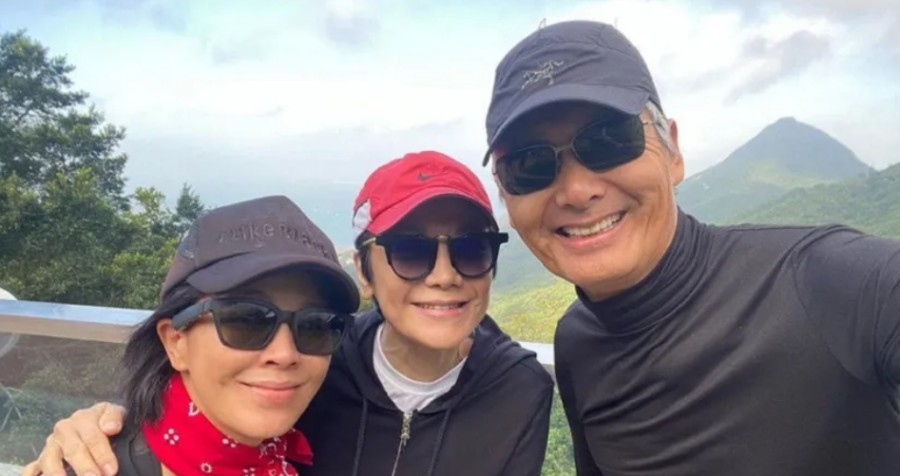 周润发和刘嘉玲(左)一起爬山。