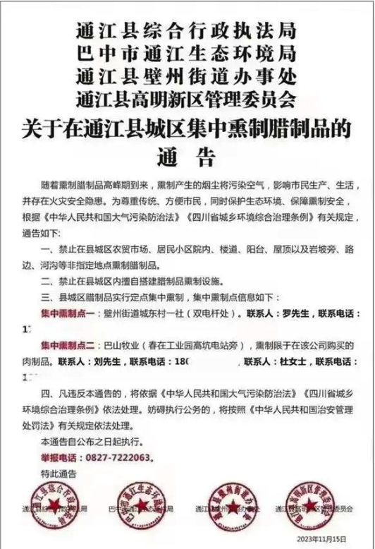 据极目新闻报道,近日,四川巴中市通江县、南江县发布通告称,城区内禁止私自熏制腊制品,熏制腊肉、腊肠等需要送到指定的集中熏制点。两县综合行政执法局表示,此举是为了应对大气污染防治,兼顾环保和用火安全。