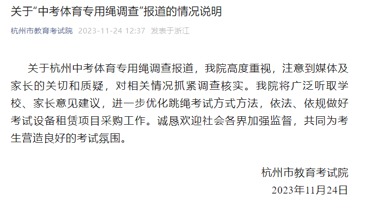 杭州市教育考试院11月24日发布《关于“中考体育专用绳调查”报道的情况说明》:
