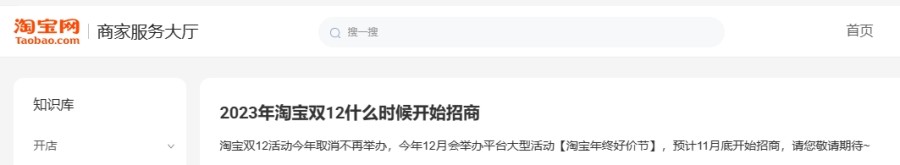 11月24日,淘宝商家服务大厅显示,淘宝双12活动今年取消不再举办,今年12月会举办平台大型活动“淘宝年终好价节”,预计11月底开始招商。