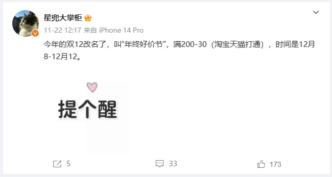 同时,美妆博主@星兜大掌柜,其11月22日的一篇帖子似乎也印证了这一消息。星兜大掌柜称“淘宝年终好价节”的优惠活动为满200减30,时间具体为12月8日至12月12日,共为期5天,淘宝与天猫一同参与活动。