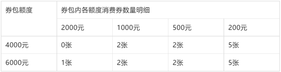 消费券券包由200元、500元、1000元和2000元面额的单张消费券组成。