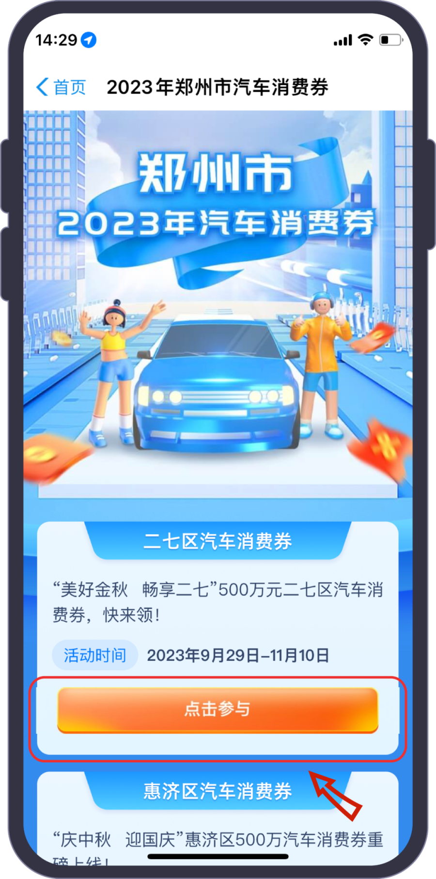 打开“郑好办”APP,点击“汽车消费券专区”,点击“二七区汽车消费券”,即可参与抢领活动。