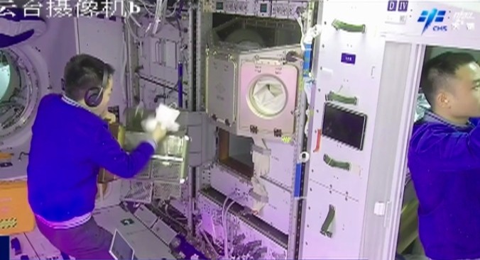 除了出差任务,神十七乘组的三名航天员还进行了载荷出舱工作,实验载荷通过梦天舱货物气闸舱的舱门进行自动出舱,展开相关空间暴露实验,这已经成为空间站内的工作常态。三位航天员密切协同运输氧气瓶组件,动作麻利、默契十足。通过问天舱的机位,我们看到航天员汤洪波正在对低温存储柜进行清洁和相关设置工作,这套低温存储装置可以满足生物、试剂、材料等样品不同低温存储条件,为开展长期空间实验提供保障。