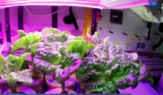 汤洪波在轨采摘品尝太空菜园里的蔬菜