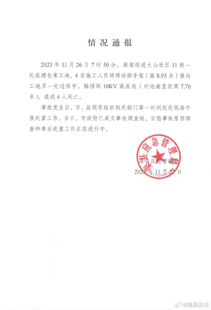 11月27日,据@渠县发布,四川达州渠县应急管理局通报:4名施工人员将移动脚手架(高8.95米)推向工地另一处过程中,触碰到10KV高压线(对地垂直距离7.76米),造成4人死亡。