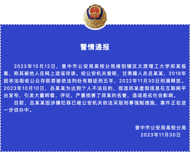 2023年10月12日,晋中市公安局高校分局接到辖区太原理工大学郑某报案,称其被他人在网上造谣诽谤。经公安机关查明,甘肃籍人员吕某某,2018年因非法吸收公众存款罪被依法判处有期徒刑五年,2022年11月30日刑满释放。2023年10月10日,吕某某为达到个人不法目的,捏造郑某虚假信息在互联网平台发布,引发大量转载、评论,严重损害了郑某的名誉,造成恶劣社会影响。目前,吕某某因涉嫌犯罪已被公安机关依法采取刑事强制措施,案件正在进一步侦办中。