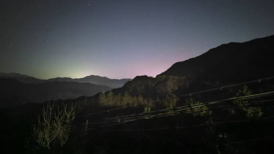 12月1日晚19点57分,北京百花山西北部灵山方向,百花山国家级自然保护区职工杨南拍摄到罕见的极光现象(照片中红色的部分)。