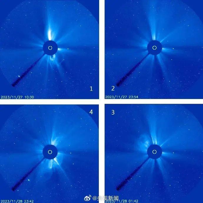 根据对过去几天空间天气监测资料的分析,太阳分别在UT(世界时)的11月27日5时、21时、22时,以及11月28日的20时左右,先后四次爆发日冕物质抛射(CME)。