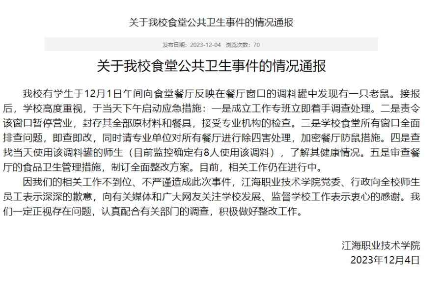 12月4日,该校通报:我校有学生于12月1日午间向食堂餐厅反映在餐厅窗口的调料罐中发现有一只老鼠。接报后,学校高度重视,于当天下午启动应急措施:一是成立工作专班立即着手调查处理。二是责令该窗口暂停营业,封存其全部原材料和餐具,接受专业机构的检查。三是学校食堂所有窗口全面排查问题,即查即改,同时请专业单位对所有餐厅进行除四害处理,加密餐厅防鼠措施。四是查找当天使用该调料罐的师生(目前监控确定有8人使用该调料),了解其健康情况。五是审查餐厅的食品卫生管理措施,制订全面整改方案。目前,相关工作仍在进行中。