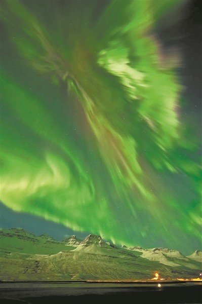 图为2012年3月8日,冰岛法斯克鲁兹约杜尔的雪山上空闪烁的极光。图片来源:NASA官网