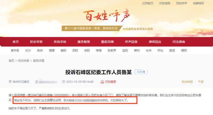 在纪委的调查结果下方,该网友再次回应,鲁某同事、领导来走访调查的当晚,她仍然把车停在这个位置,并声称“来的都是她自己人”。似乎在业主们的极力反对下,物业、警察、纪委都不能奈她何。有没有这回事?如果有,是不是刚好印证了特权的存在。