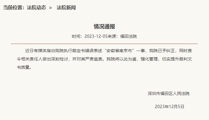 裁定书错写“安徽省南京市”,深圳福田法院通报:纠正并追责