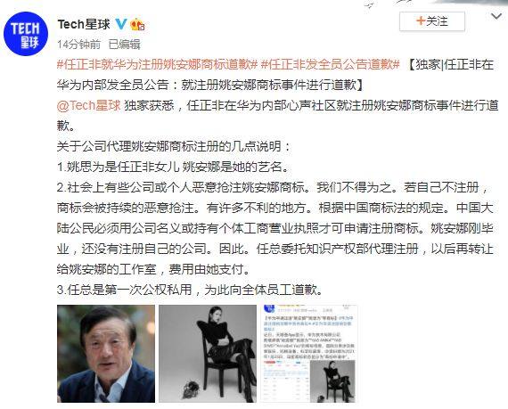 据报道,华为在内部论坛“心声社区”中就注册商标一事发布了相关说明,任正非在华为内部心声社区就注册姚安娜商标事件进行道歉。