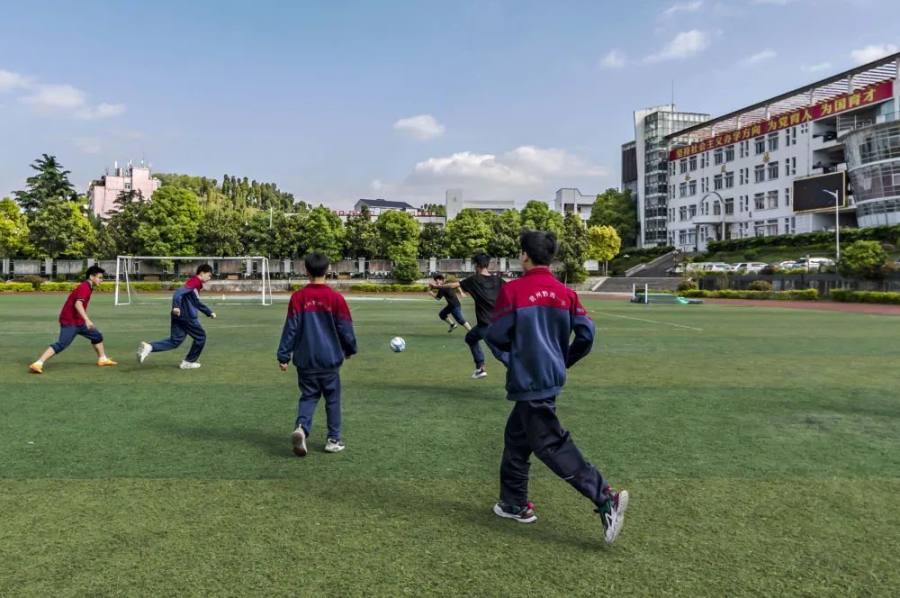 4月25日,在贵州黔西第一中学,学生在进行足球模块实战练习。新华社发(范晖摄)