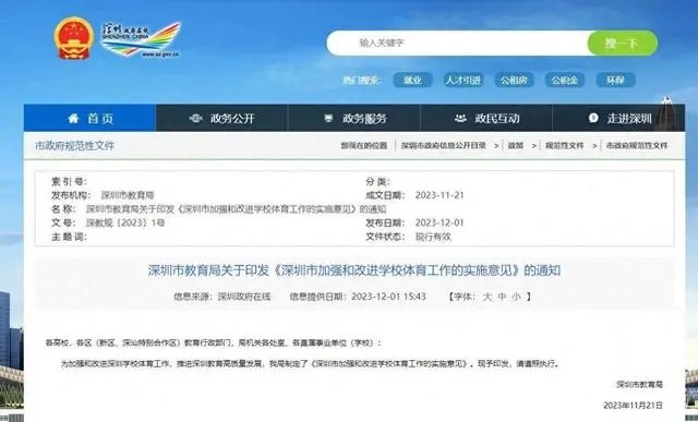 日前,深圳市教育局印发《深圳市加强和改进学校体育工作的实施意见》,要求从2024年1月1日起,义务教育阶段学校每天开设一节体育课。为保证落实,教育局工作人员表示,“责任督学每月会到校检查,人人可拨打投诉电话。”(12月6日红星新闻)