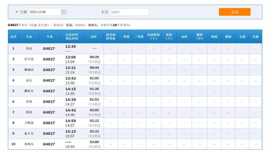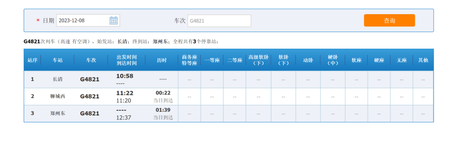 记者查询12306官方网站获悉,该网站登出了多趟济郑高铁的时刻表,列车时间是12月8日,也就意味着12月8日济郑高铁将全线通车。12月8日,G4821次列车10点58分从长清站始发,经停聊城西站,到达郑州东站, 用时1小时39分,共3个停靠站;