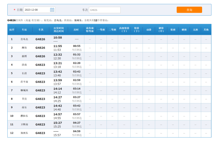 G4826次列车10点58分从青岛北站始发,经停潍坊、淄博到达济南站,经长清、茌平南、聊城西、莘县、南乐、濮阳东、卫辉南到达郑州东站,共12个停靠站,用时4小时59分;