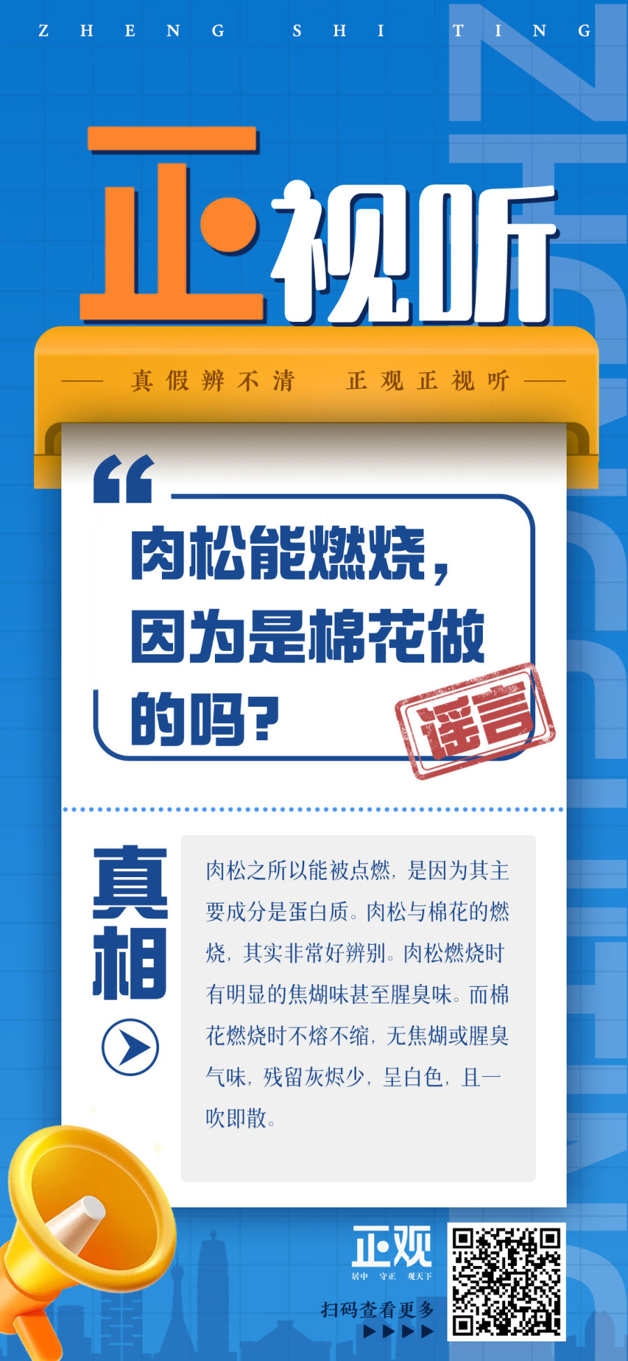 肉松与棉花的燃烧,其实非常好辨别。肉松的蛋白质成分比较高,燃烧时有明显的焦煳味甚至腥臭味。而棉花燃烧时不熔不缩,无焦煳或腥臭气味,残留灰烬少,呈白色,且一吹即散。