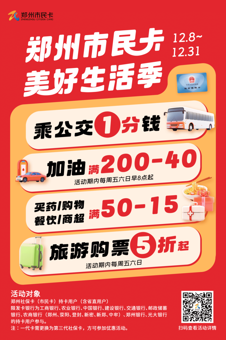 12.8-12.31,郑州社保卡(市民卡)用户使用市民卡付款码乘坐郑州全市公交车(含郑州市区、荥阳、登封、新密、新郑、中牟、航空港区、上街区)可享1分钱乘公交优惠,每天30000个优惠名额,单笔封顶优惠0.99元。活动期内,同一用户可享24次优惠(单日享2次)。