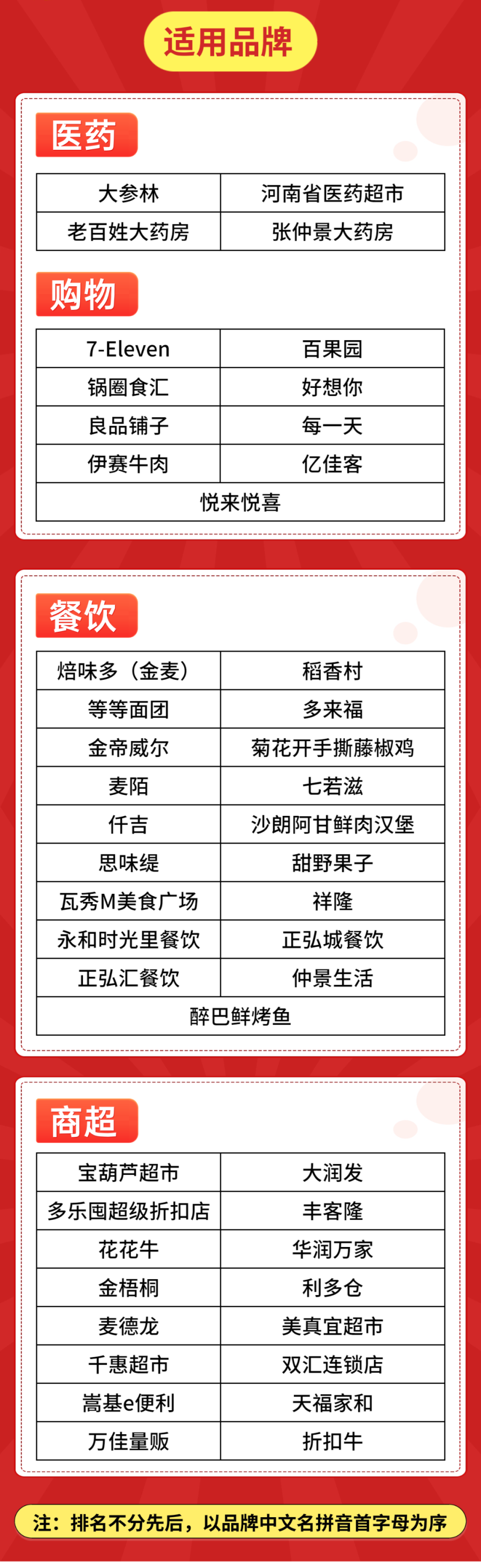 活动期间,如因商户闭店、收银机具变更等原因无法正常享受优惠,优惠名额仍旧有效,请选择其他适用门店使用。