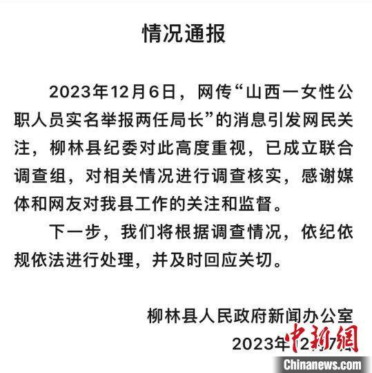 对此,山西省柳林县政府新闻办7日发布情况通报称,柳林县纪委已成立联合调查组,进行调查核实,将根据调查情况依纪依规依法进行处理,并及时回应关切。