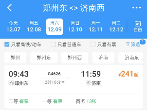 正观新闻记者查询铁路12306发现,济郑高铁车票已可正常购买。12月9日起的车次中,G4830发车时间最早,为上午9点43分,历时2小时16分到达济南,G4624票价8折出售,二等座186元。