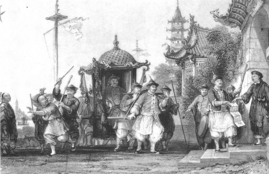 18世纪末,坐着八抬大轿、前呼后拥出行的清朝官员。