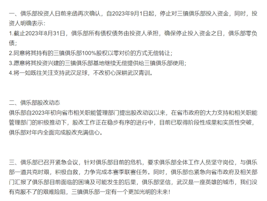 与此同时,武汉三镇俱乐部投资人表示,截至2023年8月31日,俱乐部所有债权债务由投资人承担,确保停止投入资金之日,俱乐部零负债;同意将其持有的三镇俱乐部100%股权以零对价的方式无偿转让。