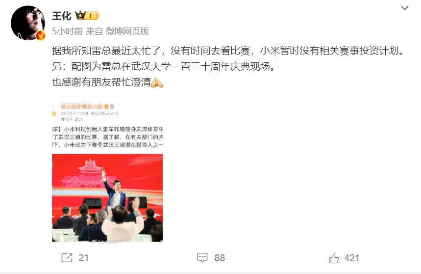 据中新体育12月7日消息,有自媒体近日发文称,小米科技创始人雷军前往武汉体育中心观看了武汉三镇对阵浦项铁人的亚冠比赛,并称小米成为下赛季武汉三镇潜在投资人之一。对此,小米集团公关部总经理王化7日发文辟谣:“据我所知雷总最近太忙了,没有时间去看比赛,小米暂时没有相关赛事投资计划。”