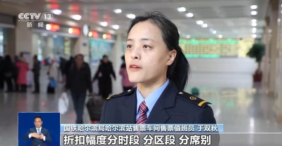 国铁哈尔滨局哈尔滨站售票车间售票值班员 于双秋:折扣幅度分时段、分区段、分席别,折扣在5.5到9.5折之间,让旅客共享铁路发展红利。