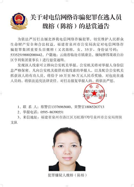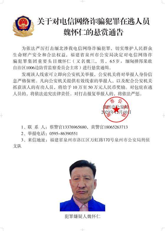 为依法严厉打击缅北涉我电信网络诈骗犯罪,切实维护人民群众生命财产安全和合法权益,辽宁省大连市公安局决定对白所成、白应苍(又名李云晨)、白应兰(又名李梦娜)进行公开悬赏通缉;福建省泉州市公安局决定对魏怀仁、魏榕(又名陈榕)、魏青松(又名杨松)进行公开悬赏通缉;福建省龙岩市公安局决定对刘正祥、刘积光(又名李华光)、刘正茂进行公开悬赏通缉;重庆市公安局决定对徐老发(又名徐发启)进行公开悬赏通缉。