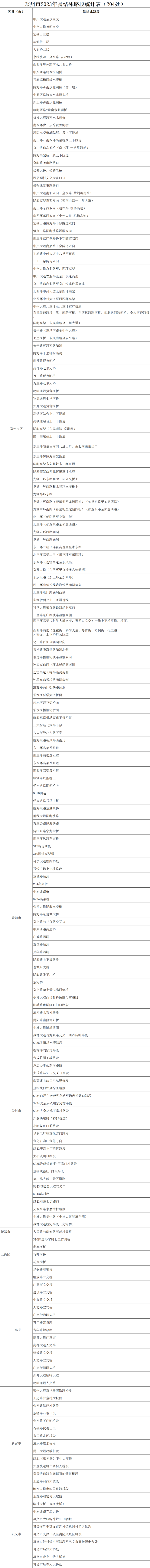 为保障今冬明春道路交通安全,切实做好低温雨雪冰冻天气防范应对,现将市公安交警部门排查出的2023年郑州市204处易结冰路段予以通告。请广大市民和司机朋友及时关注气象部门最新发布的天气预报和预警信息,尽量绕行危险路段,做好安全防护,谨慎驾驶,确保出行安全。