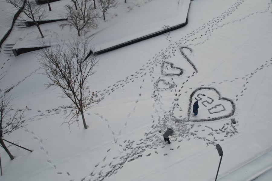 郑州蝶蝴公园内,市民在雪地里一颗心形图案旁拍照。