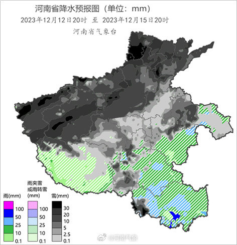 暴雪:12日夜里至14日,河南西部、北中部中雨夹雪转大到暴雪,局部大暴雪,部分县市伴有冻雨;其他县市有小到中雨转雨夹雪。累计降水量西部、东南部30到50毫米,局地60毫米左右,其他县市15到30毫米,其中雪量西部、北中部10到20毫米,局地25毫米左右,其他县市3到10毫米。15日,全省小雪或零星小雪转多云。