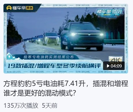 当日,懂车帝发布了《2023懂车帝冬测》系列视频的第二篇《方程豹豹5亏电油耗7.41升,插混和增程谁才是更好的混动模式?》。视频中,懂车帝对市面上的混动车型进行了测试,测试内容有两方面,一方面是在最为艰苦的极寒条件下,插混和增程两种模式哪种更省油;第二方面是哪款测试车型的纯电续航里程最长。